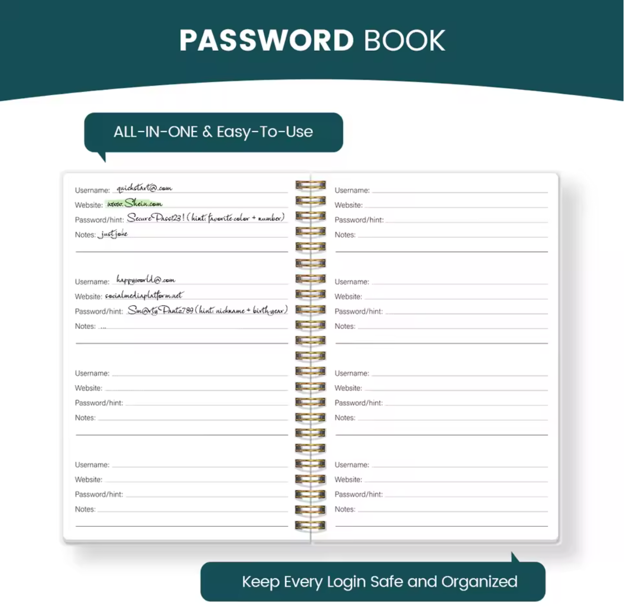 Med denne adgangskodebog samler du alle dine vigtige koder ét sikkert sted. Ingen apps, ingen digitale risici og ingen frustration over glemte adgangskoder. En enkel, overskuelig og tryg løsning til dig, der vil have fuld kontrol og mindre stress i hverdagen.