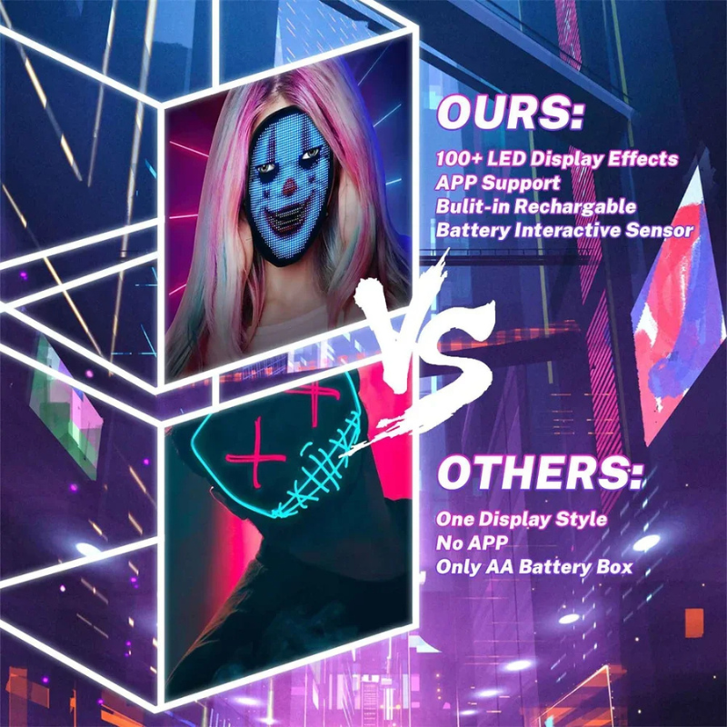 Vi præsenterer MaskeSkift® - en banebrydende LED-maske, der blander avanceret teknologi med din personlige stil og sørger for, at du skiller dig ud som aldrig før. Med en simpel Bluetooth-forbindelse til din telefon kan du skifte mellem 45 dynamiske og 70 statiske billeder - eller endda uploade dine egne brugerdefinerede kreationer!