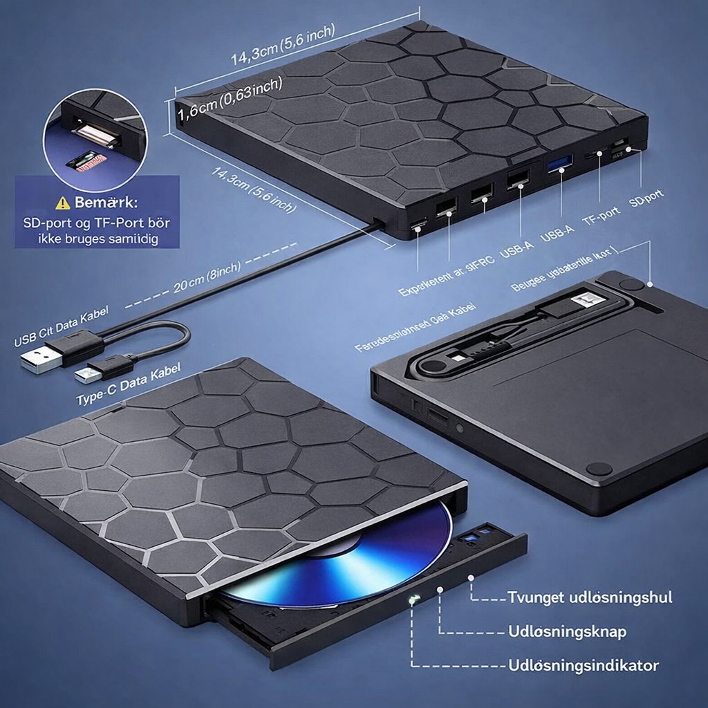Eksternt CD/DVD-drev med USB-hub og kortlæser